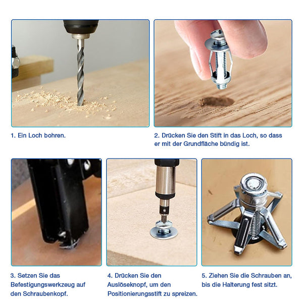 • ✅ Einfache Anwendung -------- 1. Bohren Sie ein Loch mit dem empfohlenen Durchmesser. 2. Klopfen Sie den Dübel in das Loch, bis er bündig mit der Oberfläche des Untergrunds ist. 3. Befestigen Sie das Setzwerkzeug am Schraubenkopf und drücken Sie es zusammen, um den Dübel zu spreizen (kleine Größen können mit einem Schraubendreher gesetzt werden). 4. Entfernen Sie die Schraube und stecken Sie sie durch das Anbauteil und dann zurück in den Dübel. Ziehen Sie die Schraube an, bis die Halterung fest sitzt.
