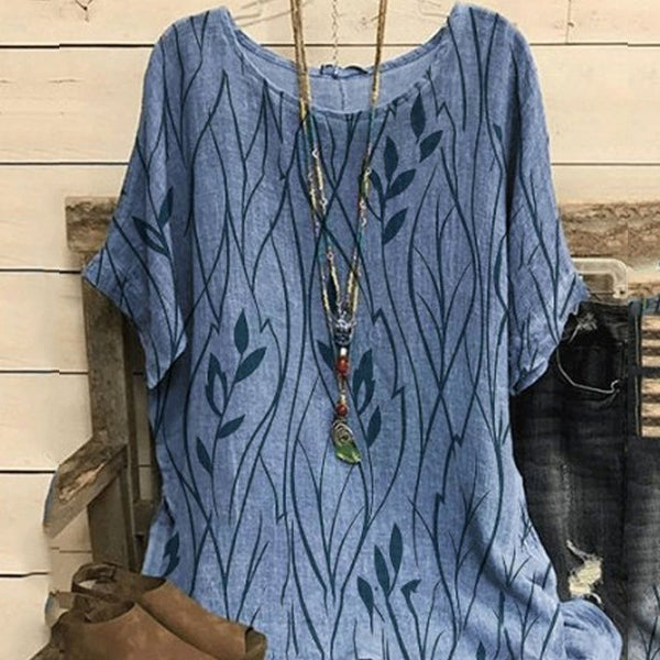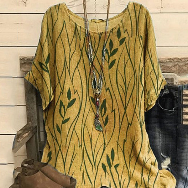 Damen Lässiges Rundhals-T-Shirt aus Baumwolle und Leinen