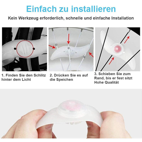 • 【WASSERDICHT & EINFACH EIN / AUS】 - Sie sind wasserdicht und haben vorinstallierte Batterien. Drücken Sie es in die Speichenrillen des Fahrradrads und schieben Sie es in Richtung Felge, bis der Sitz fest sitzt. Dann bleibt es sicher an Ort und Stelle. Einfaches Ein- und Ausschalten der Fahrradbeleuchtung und Ändern der Blinkmodi durch Drücken der Mitte.