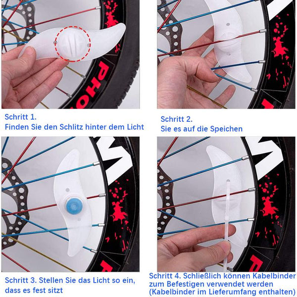 • 【EINFACHE INSTALLATION】 - Sehr einfach zu installieren und direkt nach dem Auspacken zu bedienen. Rasten Sie sie einfach direkt auf Ihre Fahrradspeichen ein und schalten Sie das Licht ein, indem Sie die einzige Taste am Gerät drücken. Wenn Ihre Fahrradspeichen dicker als normale Straßenreifen sind, können Sie sie mit Kabelbindern sichern, um sie stabil zu machen. Geeignet für die meisten Φ2mm Speichen.