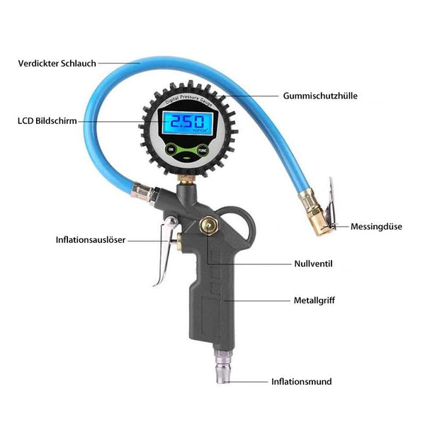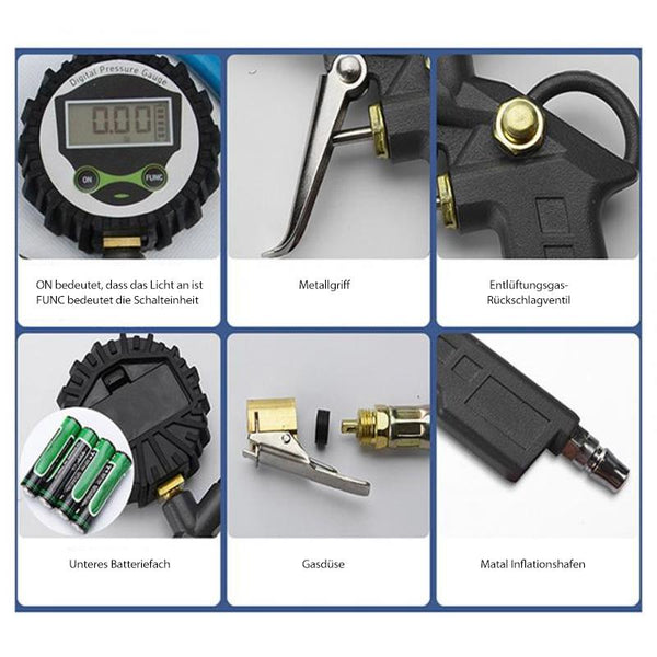 • Das Reifendruckmessgerät hat die Funktion, die Reifen zu entleeren, aufzupumpen und zu testen, und eine Luftpumpe kann an den Fahrzeugmotor angeschlossen werden, um eine Staubblasfunktion zu haben.