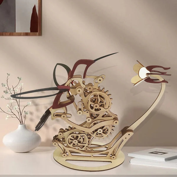 Dies ist eine kinetische Holzskulptur, die die Bewegung eines Kolibris im Flug simuliert. Jedes Bewegungselement ist wunderschön, von den schlagenden Flügeln bis zum ausgestellten Schwanz. Komplizierte Systeme aus handgefertigten Teilen erwecken die Skulptur zum Leben.