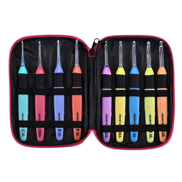 • Komplettes Häkelset: LED-Häkelnadeln der Größen C bis K, die farbcodiert sind. Eine von jeder Größe: C (2,5 mm), D (3,0 mm), E (3,5 mm), F (4,0 mm), G (4,5 mm), H (5,0 mm), I (5,5 mm), J (6,0) mm) und K (6,5 mm). Unsere leichten Häkelnadeln werden auch mit einer perfekten roten Häkelnadel geliefert. Bewahren Sie alle Ihre Leuchthaken in dieser robusten und wasserfesten Häkelnadelhülle auf und machen Sie sich keine Sorgen, dass Sie wieder Häkelnadeln oder Häkelnadeln verlieren!