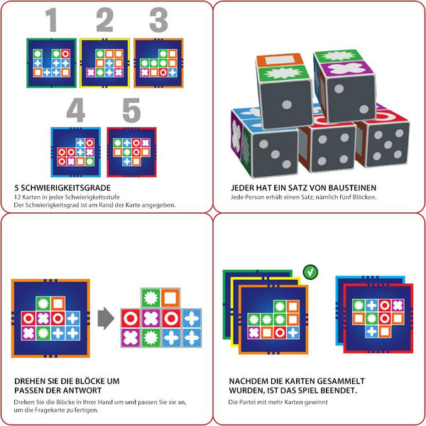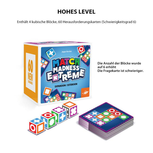 • Paket: Basic: Match Madness Brettspiel*1, Spielenblöcke*20 (4 Sätze mit 5 Blöcken pro Satz), Musterkarten*60 (12 Karten in 5 Schwierigkeitsstufen)                              Hohes Level: 4 kubische Blöcke, 60 Herausforderungskarten (Schwierigkeitsgrad 6)