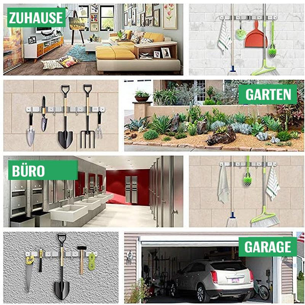 Räumen Sie Ihren Besen, Mopp, Rechen, Werkzeuge und mehr auf! Perfekt für Küche, Schrank, Garage, Büro, ideal für den gewerblichen Gebrauch. Dank des wetterfesten Designs eignet sich dieser Besenmopphalter sogar im Freien oder auf dem Schuppen für Ihre Gartengeräte!
