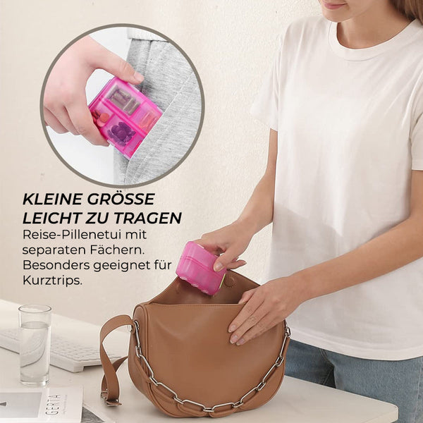 ⏰ Tragbar – Reise-Pillenetui mit separaten Fächern. Besonders geeignet für Kurztrips. Kleine Größe, leicht zu tragen.