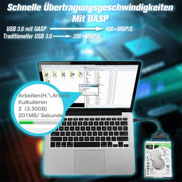 Der USB 3.0 auf SATA III-Festplattenadapter bietet eine hohe Geschwindigkeit, mit der Sie den externen Speicherplatz und die Sicherungsdaten erhöhen können. Mit den neuesten internen SATA III 6 Gbit / s und USB 3.0 5 Gbit / s extern mit einer beeindruckenden Datenübertragungsrate von bis zu 5 Gbit / s. Verbessert mit beschleunigten Übertragungsprotokollen-UASP (USB Attached SCSI Protocol). Ermöglicht es Ihnen, SSD-Laufwerke mit einer Gesamtgeschwindigkeit von 70% schneller als herkömmliche Festplattenlaufwerke zu nutzen.