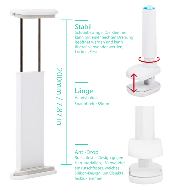 • Verstärkter Basisclip: Der Universalständer hat einen verstellbaren Sockel und sein rutschfestes Silikondesign verbessert den Griff und schützt Ihre Möbel vor Kratzern. Es kann Ihr Mobiltelefon fest auf dem Schreibtisch, dem Bettrahmen, dem Nachttisch, dem Kopfteil und den Küchentischen usw. installieren.