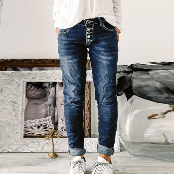 • Design: Eine bequeme Jeanshose mit mittlerer Leibhöhe, schmaler Passform, Seitentaschen, voller Länge, elastischer Taille und Knopfverschluss, hochwertigem Material, geradem Bein, gewaschenem, geradem Saum und klassischem Design.