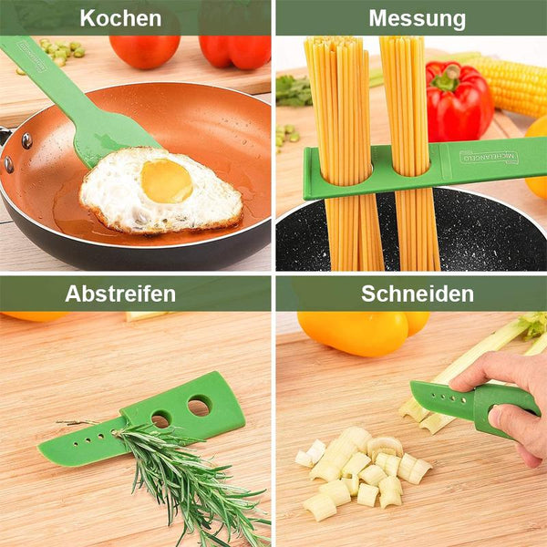 8-in-1 KÜCHENGERÄT - Mit NEUEM, PATENTIERTEM DESIGN, Das vielseitige 8-in-1 Kochutensilien-Set ist Ihr großartiger Helfer, um mehrere Kochaufgaben effizient zu erledigen, ohne die Schalterkochwerkzeuge zu behalten. Mit diesem Produkt können Sie schneiden, servieren, streifen, messen, trennen, zerdrücken, wenden und abseihen.