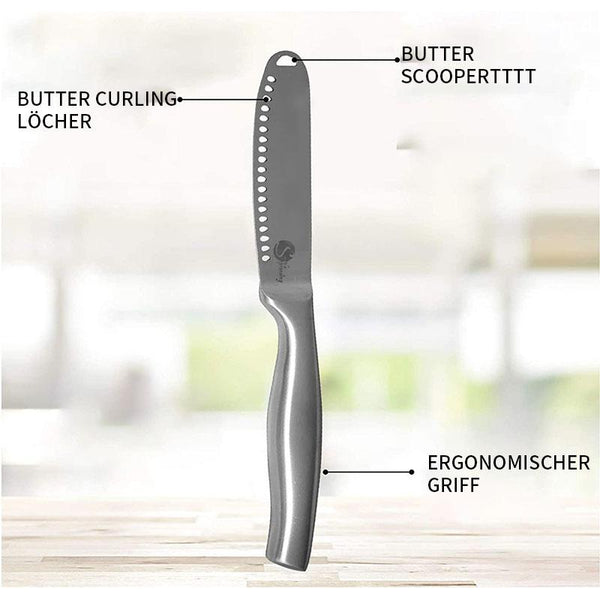 • DESIGN: Wir haben dieses schöne Küchenwerkzeug entworfen, das als Butterstreuer und Butterlockenmesser verwendet werden kann. Wunderschönes Design, perfekte Gewichtsbalance und 1-Zoll-Klinge machen es perfekt, um die richtige Menge Butter / Marmelade / Cremes auf Ihrem Toast zu verteilen.