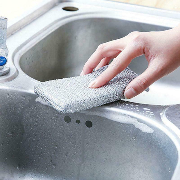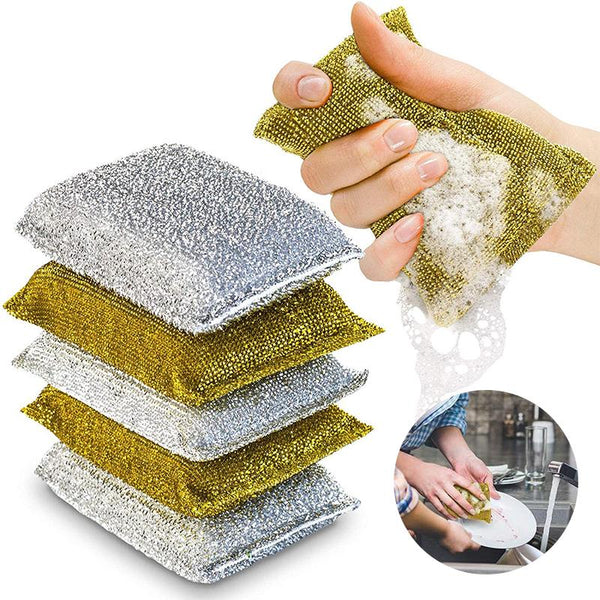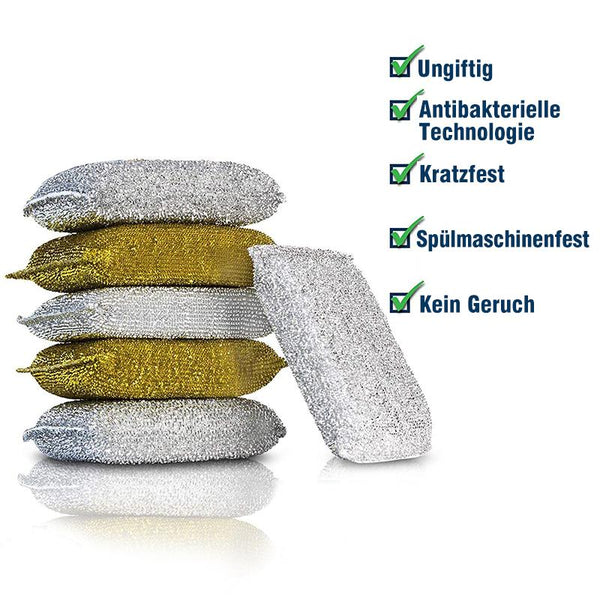 Diese Reinigungsschwämme bestehen aus metallischem Polyester über einem dicken, saugfähigen Schwamm, um Töpfe und Pfannen auf einen brillanten Glanz zu polieren. Die Matten sind antibakteriell, rosten nicht und reinigen jedes Mal kräftig und kraftvoll.