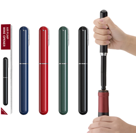 Der kreative Öffner nutzt das Prinzip des Luftdrucks, indem er durch ein kleines Nadelrohr Luft in die Flasche pumpt, sodass der Luftdruck in der Flasche steigt und der Korken durch die Differenz zwischen Innen- und Außendruck vollständig herausgedrückt wird. Der Kork hinterlässt keine Spuren, aber der Prozess ist ein Hingucker.