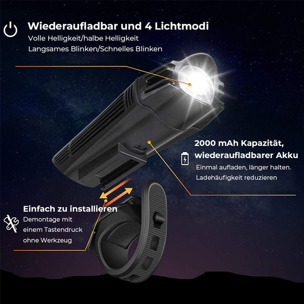 • ✔ Fortschrittliches Design: USB wiederaufladbare Vorder- und Rücklichter, eingebauter 2000 mAh wiederaufladbarer Lithium-Akku für Scheinwerfer und eingebauter 330 mAh wiederaufladbarer Lithium-Akku für Rücklicht.