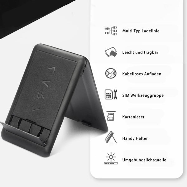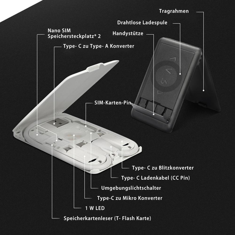 • Schalten Sie einfach die KableCARD-Karte ein, um die Telefonhalterfunktion in einen Telefonhalter umzuwandeln, sodass Sie Filme bequem kabellos aufladen, ansehen, füllen und mitnehmen können. Zusätzliche Lichtquelle - Umgebungslicht Wir haben einen dreistufigen Schalter für KableCARD mit einer diffusen Folie und einer reflektierenden Folie entworfen, die 1 W weiches diffuses Licht auf einen Tisch oder eine Wand reflektiert, um effektives polarisiertes Licht zum Schutz Ihrer Augen zu erzeugen.