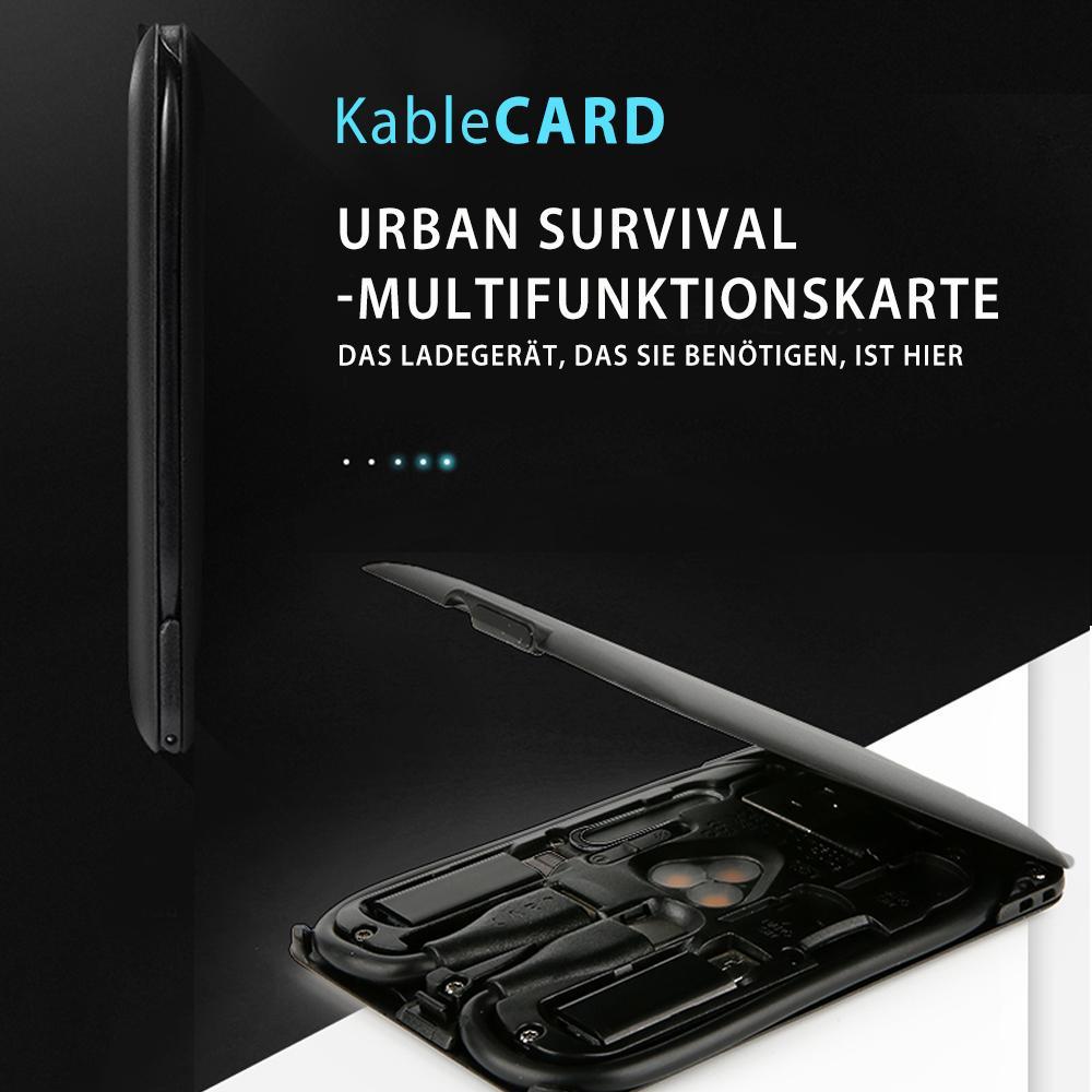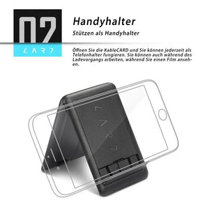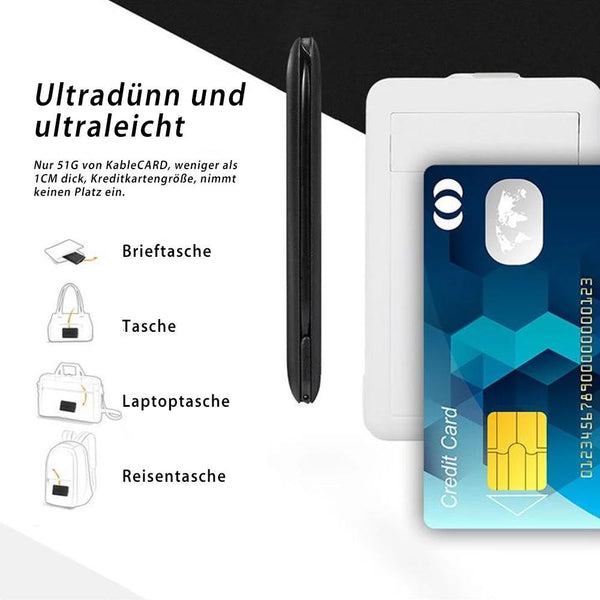 • Wenn andere immer noch keinen Strom mehr haben, müssen sie aus der Tiefe des Beutels nach der Ladeleitung suchen. ... mit KableCARD müssen Sie sich keine Gedanken darüber machen, welche Art von Ladekabel verwendet werden soll. Nehmen Sie die KableCARD einfach aus Ihrer Tasche oder Brieftasche und nutzen Sie sie überall. Wer ist effizienter als Sie?