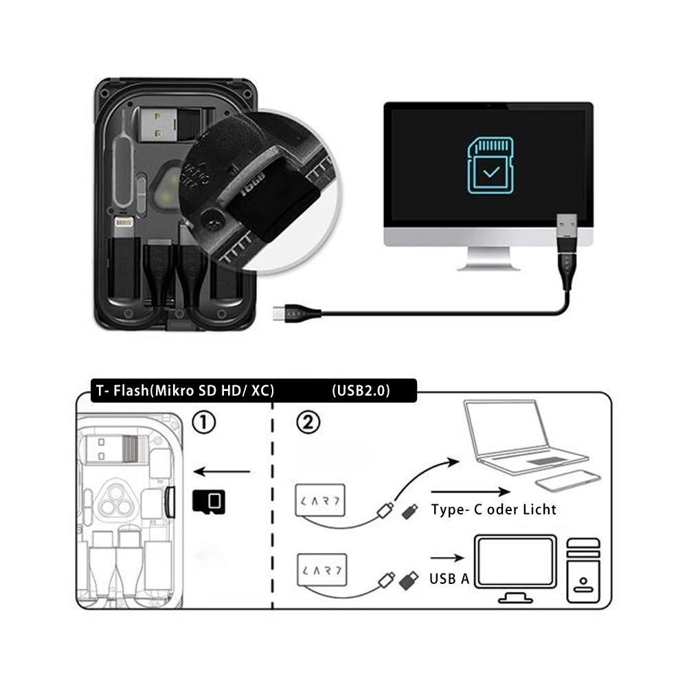 • Der eingebaute Kartenleser hat kein Netzwerk. So übertragen Sie Daten auf ein USB-Flash-Laufwerk können ... aber mein MacBook hat nur eine C-Typ-Buchse. Wie man die KableCARD die Speicherkarte lesen lässt, unterstützt auch USB- und C-Typen.